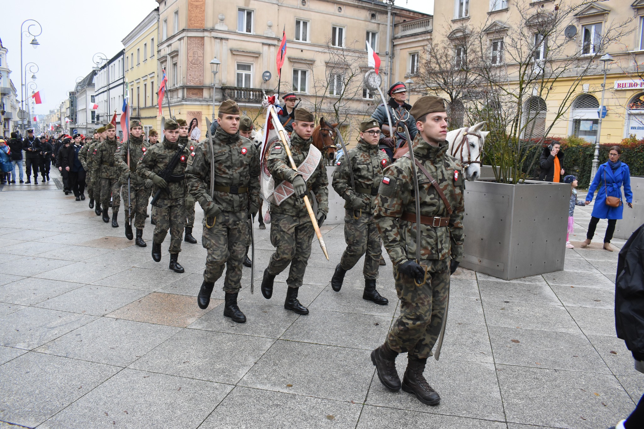 Po modlitwie, zebrani przeszli na plac przed dawnym Pałacem Biskupów Krakowskich gdzie w południe wspólnie zaśpiewali hymn państwowy. Następnie uczesnicy przemaszerowali ulicami centrum Kielc przed pomnik Marszałka Józefa Piłsudskiego na Placu Wolności na oficjalną część uroczystości. W wydarzeniu uczestniczył dr Robert Piwko, naczelnik Delegatury Instytutu Pamięci Narodowej w Kielcach.