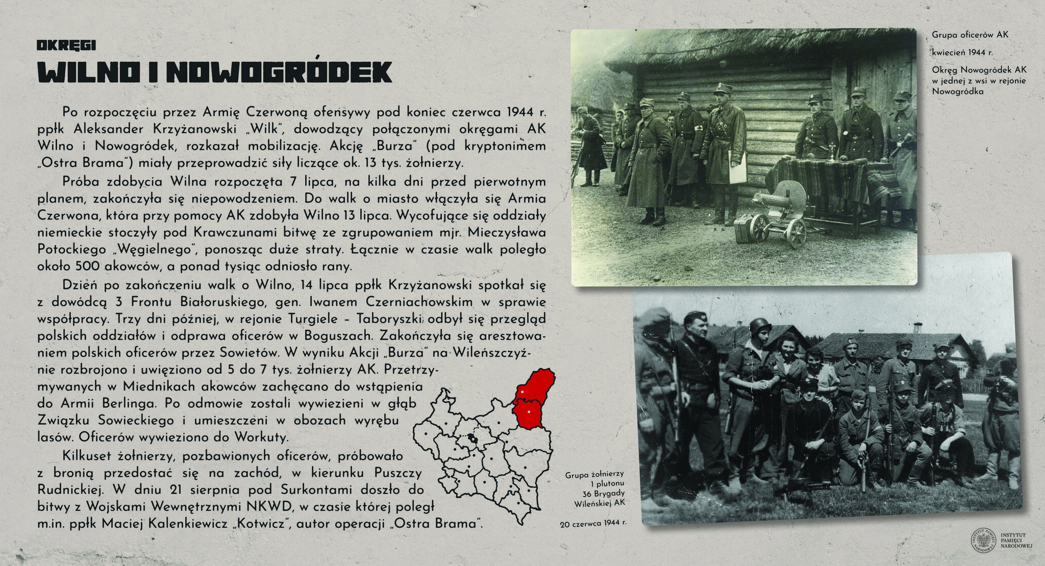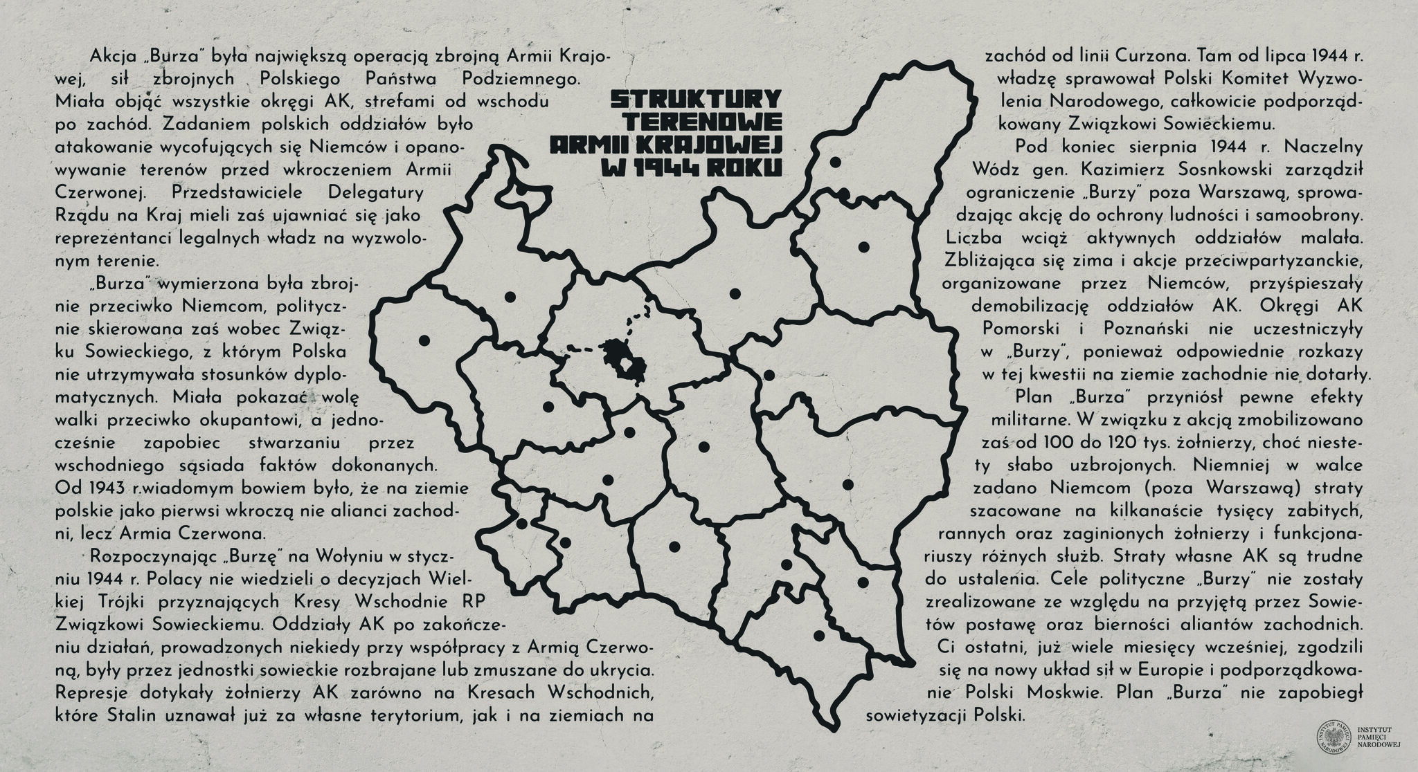 Akcja „Burza” była największą operacją zbrojną Armii Krajowej, sił zbrojnych Polskiego Państwa Podziemnego. Miała objąć wszystkie okręgi AK, strefami od wschodu po zachód. Zadaniem polskich oddziałów było atakowanie wycofujących się Niemców i opanowywanie terenów przed wkroczeniem Armii Czerwonej. Przedstawiciele Delegatury Rządu na Kraj mieli zaś ujawniać się jako reprezentanci legalnych władz na wyzwolonym terenie.