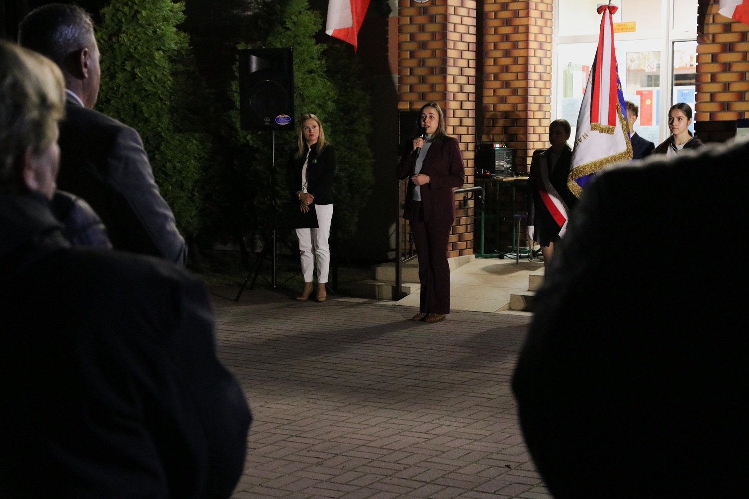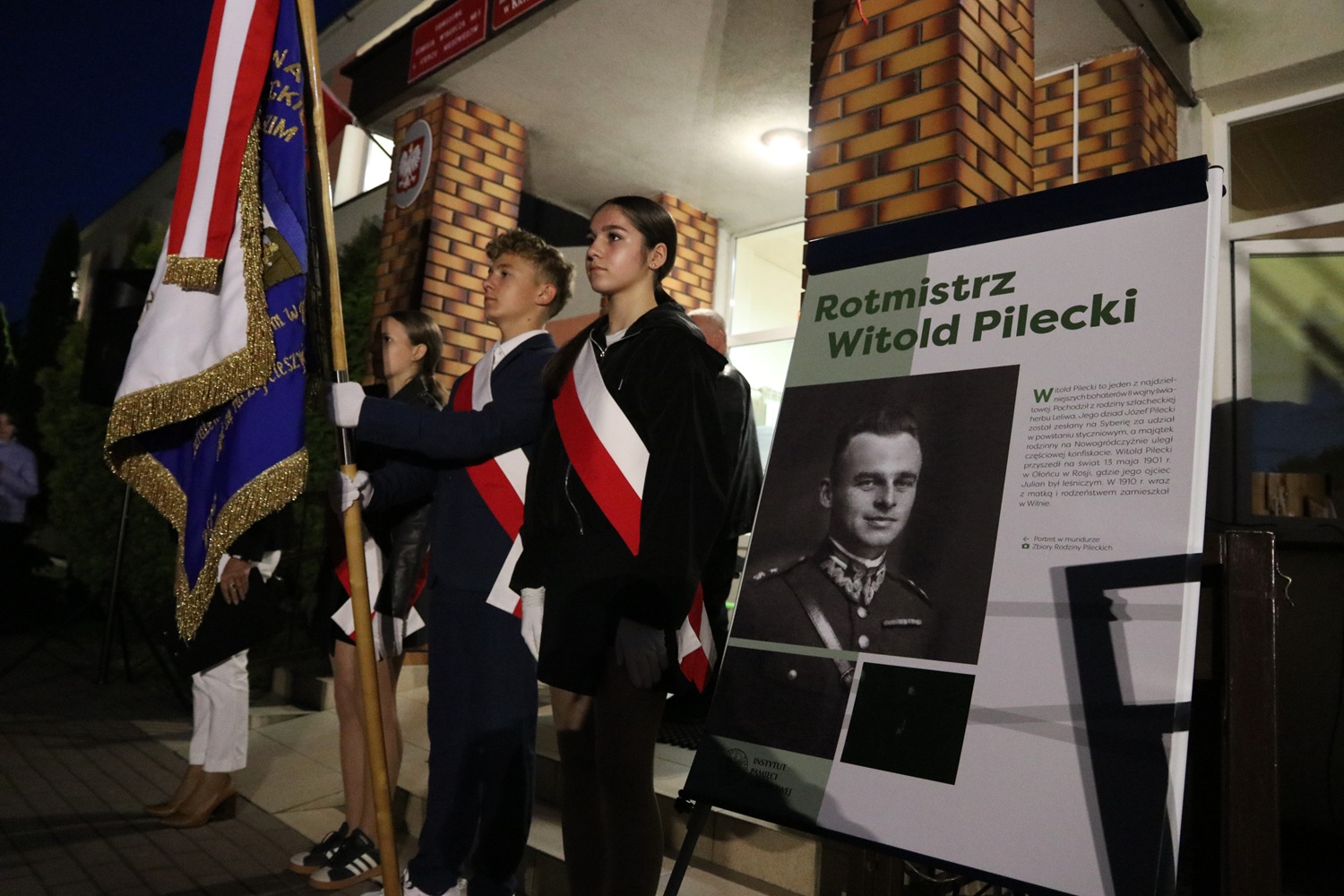 • Krasocin, 23 maja 2025 r. przed tablicą pamiątkową znajdującą się w budynku Zespołu Placówek Oświatowych im. rtm. Witolda Pileckiego w Krasocinie