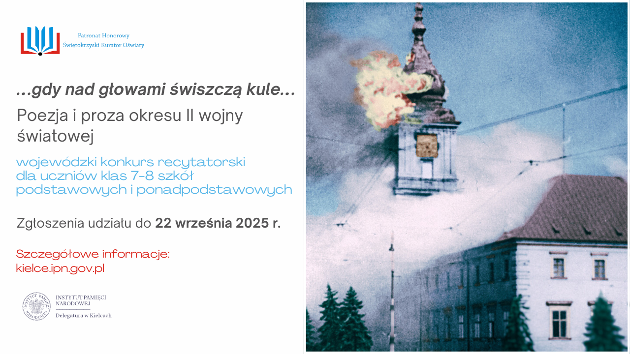 Przesłuchanie Uczestników wyłonionych podczas eliminacji szkolnych i rozstrzygnięcie konkursu odbędzie się w dniach 25-26 września 2025 r. w CE IPN „Przystanek Historia” w Kielcach przy ul. Warszawskiej 5.