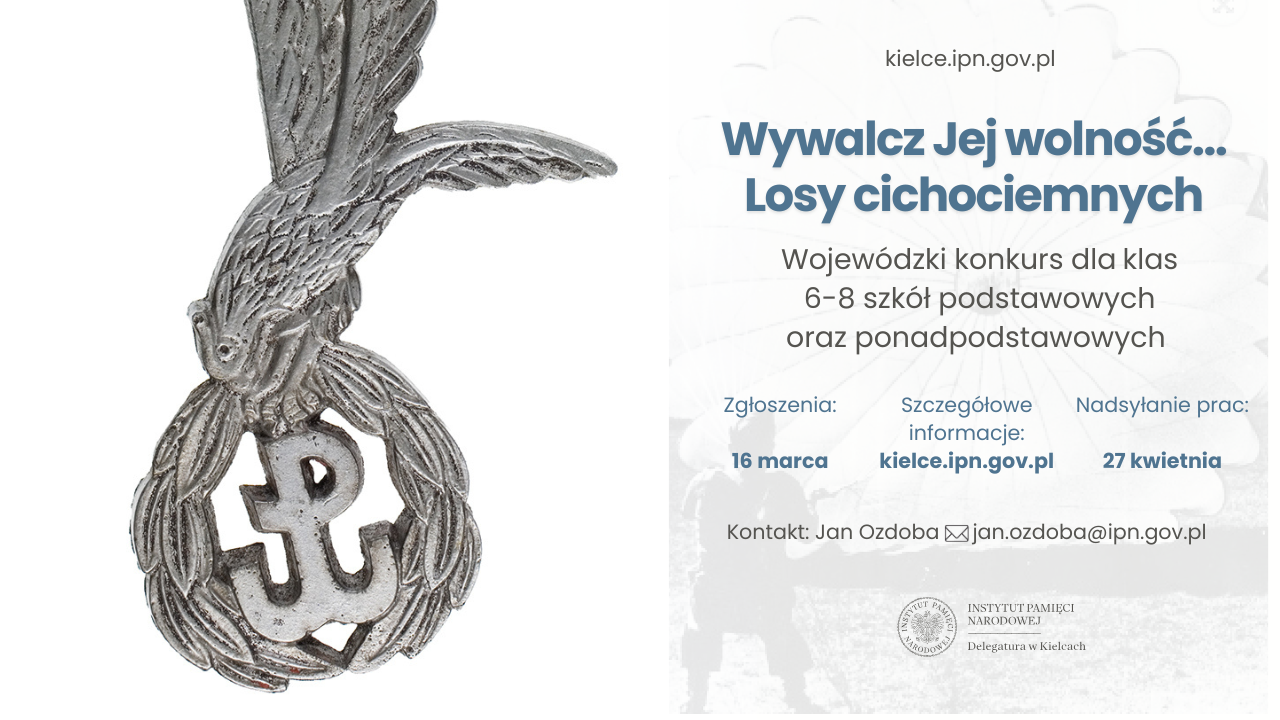 Konkurs dla uczniów klas 6-8 szkół podstawowych oraz ponadpodstawowych zorganizowany został dla upamiętnienia 85. rocznicy pierwszego zrzutu cichociemnych na tereny okupowanej Polski. Jego celem jest upowszechnienie wiedzy na temat działalności żołnierzy Polskiego Państwa Podziemnego, którzy w czasie II wojny światowej byli zrzucani na spadochronach do okupowanego kraju i ich losów, również powojennych.