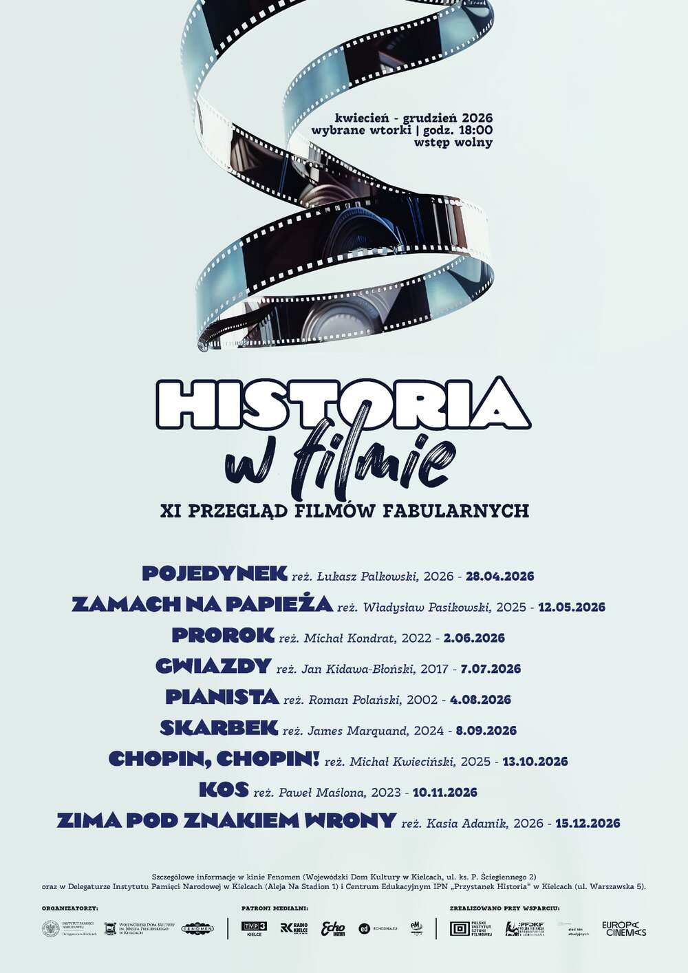 XI Przegląd Filmów Fabularnych „Historia w filmie” to dziewięć filmów. W repertuarze znalazły się głośne tytuły, takie jak: „Pianista”, reż. Roman Polański (2002), czy „Chopin, Chopin!”, reż. Michał Kwieciński (2025), ale również nowości, np. „Pojedynek”, reż. Łukasz Palkowski (2026) oraz „Zima pod znakiem wrony”, reż. Kasia Adamik (2026).
