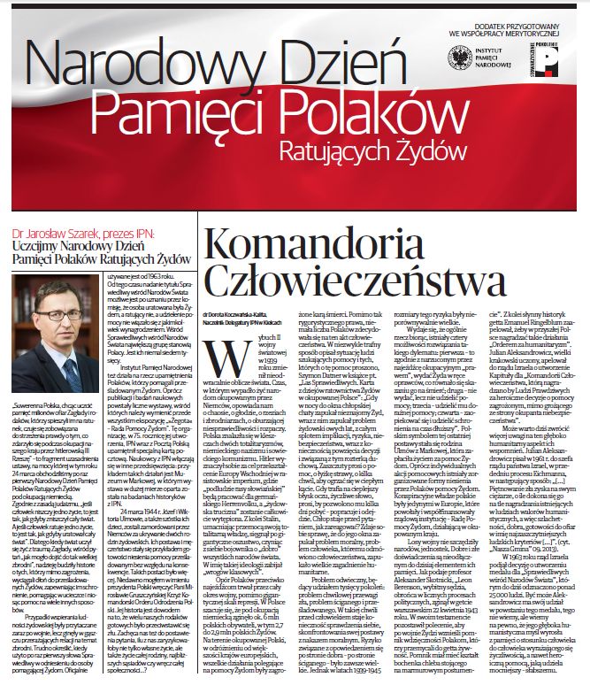 W kilkunastu gazetach codziennych w całym kraju, w poniedziałek 26 marca 2018 r. ukazał się dodatek edukacyjny przygotowany przez Instytut Pamięci Narodowej z okazji Narodowego Dnia Pamięci Polaków ratujących Żydów pod okupacją niemiecką. W województwach małopolskim i świętokrzyskim dodatek został dołączony do „Dziennika Polskiego” i „Echa Dnia”. Na pierwszej stronie znalazł się artykuły,autorstwa naczelnik Delegatury IPN w Kielcach, dr Doroty Koczwańskiej-Kality oraz prezesa IPN dr. Jarosława Szarka.
