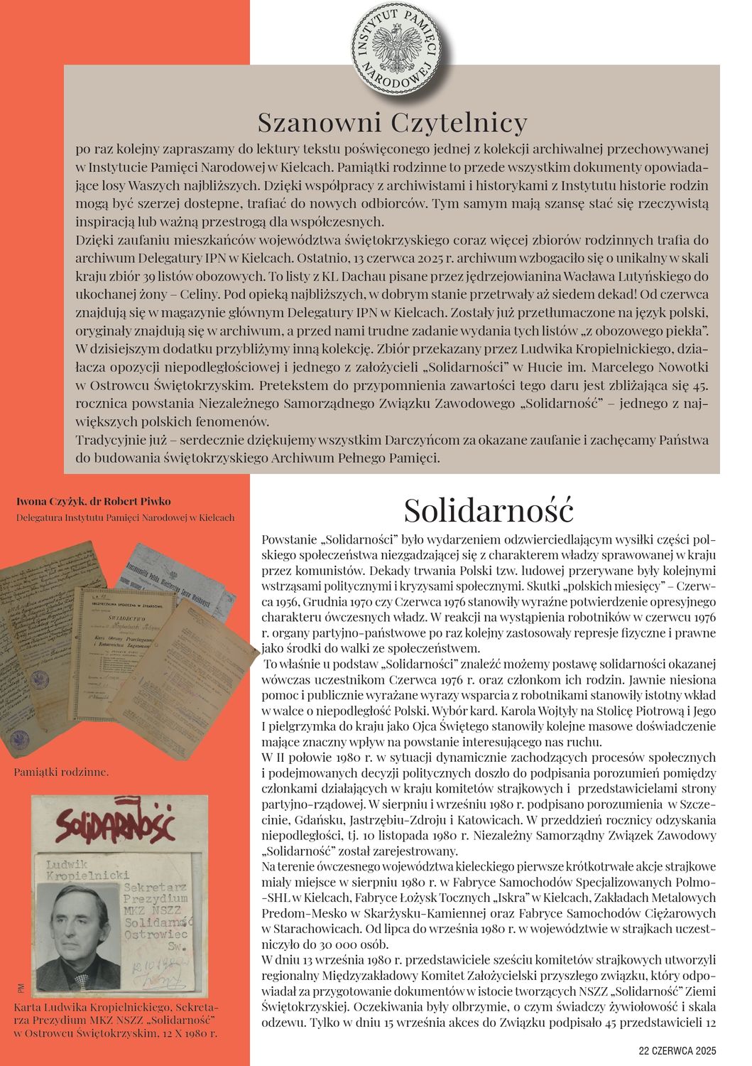 W dzisiejszym dodatku przybliżymy zbiór przekazany Delegaturze IPN w Kielcach przez Ludwika Kropielnickiego, działacza opozycji niepodległościowej i jednego z założycieli „Solidarności” w Hucie im. Marcelego Nowotki w Ostrowcu Świętokrzyskim. Pretekstem do przypomnienia zawartości tego daru jest zbliżająca się 45. rocznica powstania Niezależnego Samorządnego Związku Zawodowego „Solidarność” – jednego z największych polskich fenomenów.