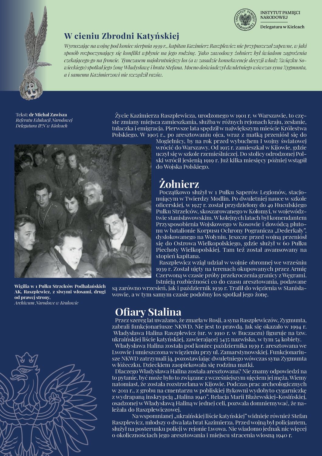 Kapitan Kazimierz Raszplewicz brał udział w wojnie obronnej we wrześniu 1939 r., trafi na „nieludzką ziemię”, walczył w armii Andresa, był też jednym z cichociemnych. Koleje życia kpt. Raszplewicza splatają się z tragiczną historią jego bliskich. Jak pisze dr Zawisza, jako zawodowy żołnierz był świadom zagrożenia czekającego go na froncie. Tymczasem najokrutniejszy los spotkał członków jego rodziny. Żona, Władysława Halina Raszplewicz (ur. w 1910 r. w Buczaczu), figuruje na tzw. ukraińskiej liście katyńskiej, zawierającej 3435 nazwiska, w tym 54 kobiety. Widnieje na niej również Stefan Raszplewicz, młodszy o dwa lata brat Kazimierza. Przed wojną był policjantem, służył na posterunku policji w rejonie Lwowa.